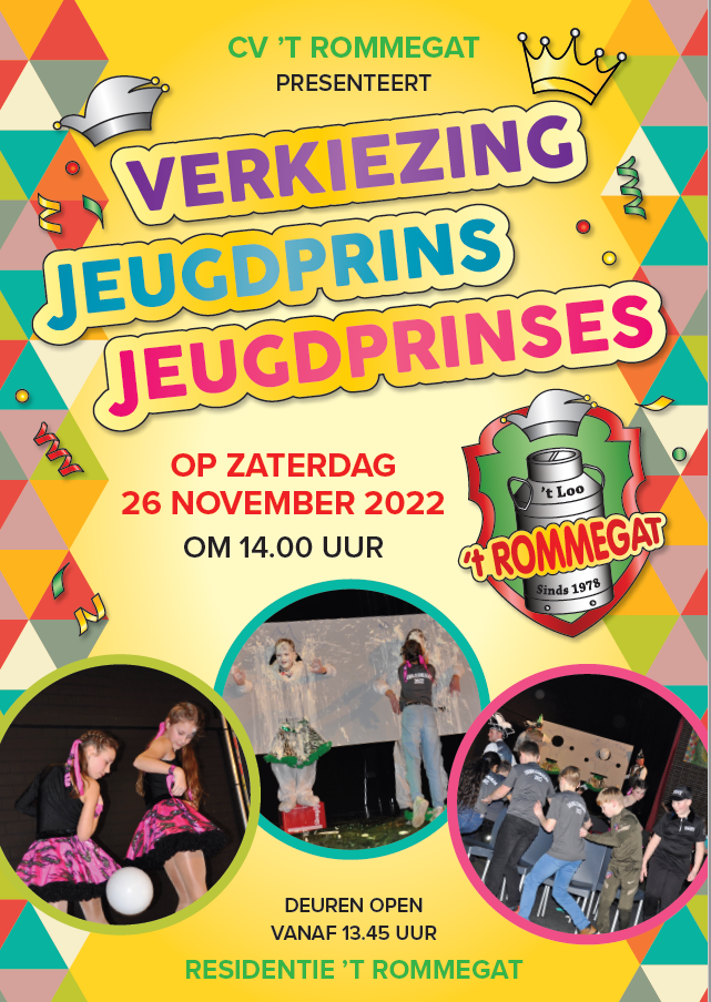 Op zaterdag 26 november 2022 gaan de deuren van onze Residentie op ‘t Loo open om 13.45 uur. Als eerste wordt er afscheid genomen van Jeugdprins Rijnt en Jeugdprinses Saar. Hierna volgen er diverse spelrondes, afgewisseld met diverse en leuke jeugdoptredens. Uiteindelijk komen er twee winnaars uit, die vervolgens het komende jaar Jeugdprins en Jeugdprinses zijn van ‘t Rommegat. Ben je ook benieuwd wie de nieuwe jeugdprins en jeugdprinses gaan worden ? Kom dan kijken !